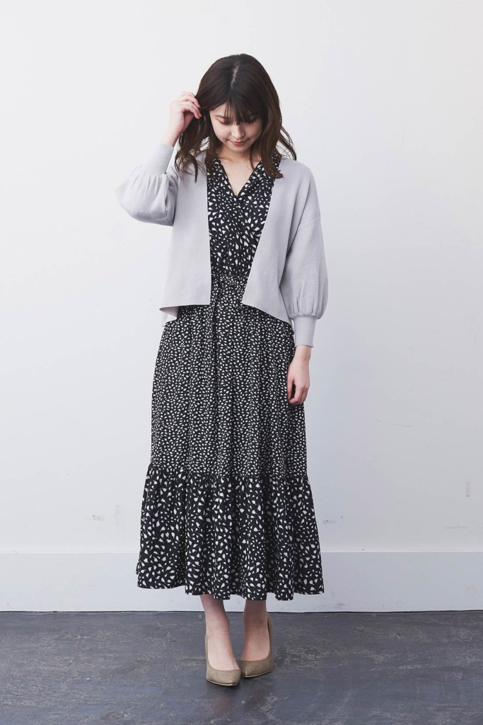 柄ワンピース×ボレロのニュアンスコーデ
