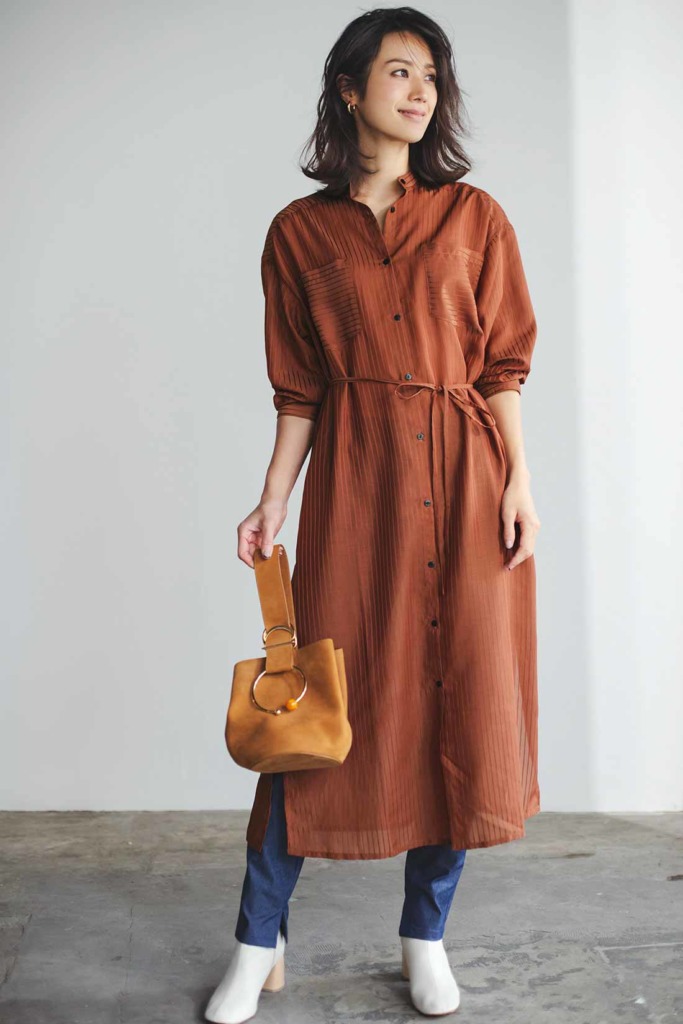 シャツワンピースはテラコッタで今っぽく