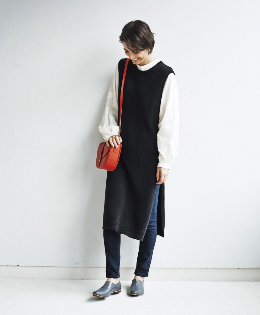 季節問わず着まわせる白ブラウスは、秋だからこそ楽しめるレイヤードスタイルに。ベストワンピースとのレイヤードなら、縦ラインが強調されてすっきり!体型が気になる大人世代の悩みを解消してくれます。シャープな衿がついた白シャツならよりハンサムな印象になるので、ブラウスやシャツを選ぶ際は衿の形に注目しましょう。縦ラインが強調されたコーデには、バッグもショルダータイプにすると、よりすっきりとします。