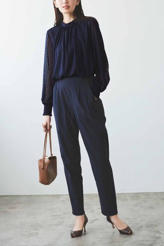 ほんのり肌見せができるシアー素材のブラウスは、衿もとのたっぷりしたギャザーが着映え感抜群。同系色のすっきりしたテーパードパンツを選んで、ブラウスの華やかさを引き立てます。きれいめな服装に合わせて足もとはヒールパンプスを投入。自然とスタイルアップも叶う、レディーライクなパンツスタイルです。