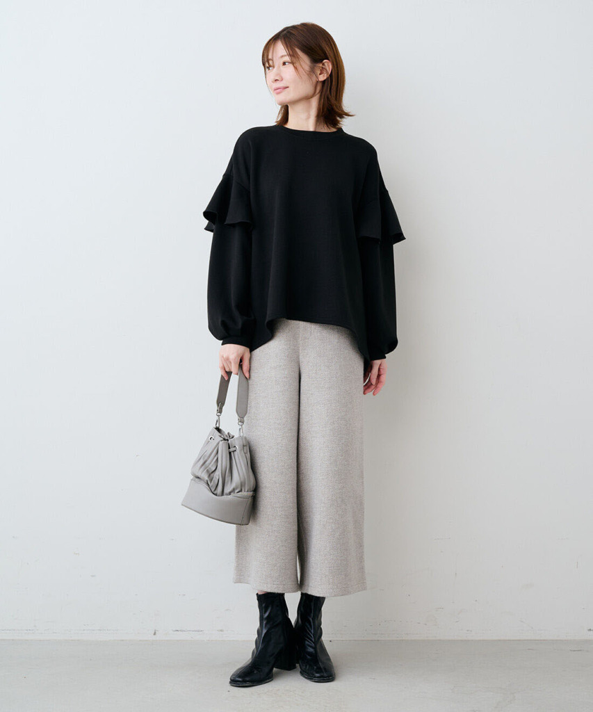 人と会う機会が多くなるのに、体形も気になる……という方が多い40代。スウェットを使ったコーデでも大人の上品さを意識しましょう。ブラックのトレーナーはぽわんとした袖口が女性らしいデザイン。揺れ感のあるスカートや長め丈のキュロットパンツで、華やかな印象に仕上げれば、万人受けばっちりな上品スタイルが完成。