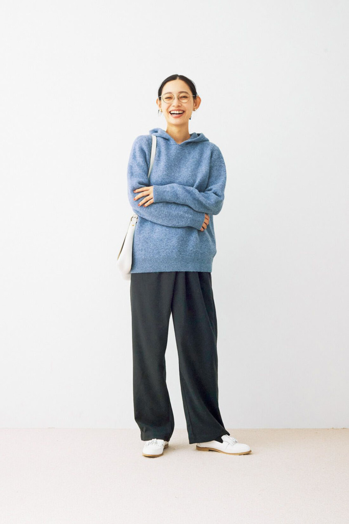 パーカーにパンツというと、部屋着っぽく見えそうな組み合わせ。実は選び方にコツがあります。特に50代は生地やシルエットの美しさにこだわりましょう。霜降りニット生地のようなパーカーはコーデの上質さを引き上げてくれる1着。ツヤのあるスラックスと合わせれば、抜け感があり上品なカジュアルコーデに仕上がります。