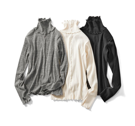 ニットトップスのレイヤードで楽しむなら、薄手のタートルネックがおすすめ。首元からちらりとインナーが見えれば、さりげないおしゃれが楽しめます。白・グレー・黒ならどんなスタイルにも使えて便利です。メロウフリルがインに重ねたときにかわいく着こなしがぐっと華やかになります。