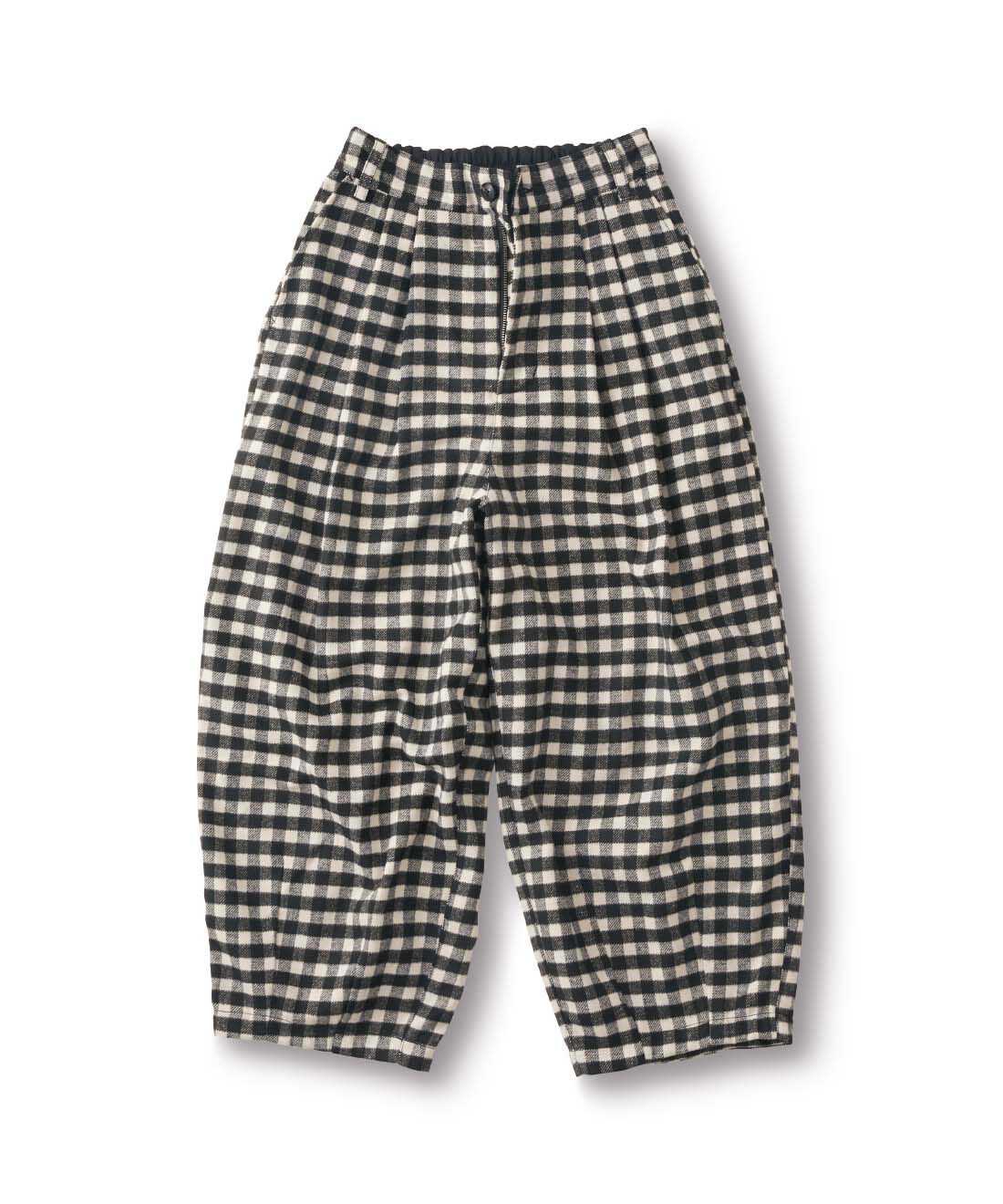 起毛感のあるブランケット素材を使用した、見た目にも暖かなギンガムチェックパンツ。大胆なボリュームを持たせたワイドシルエットながら、裾に入れたダーツで足元をすっきりと。裾が少しすぼまったデザインは、ショートブーツやハイカットスニーカーとも好相性。足元のおしゃれも楽しめる丈感です。