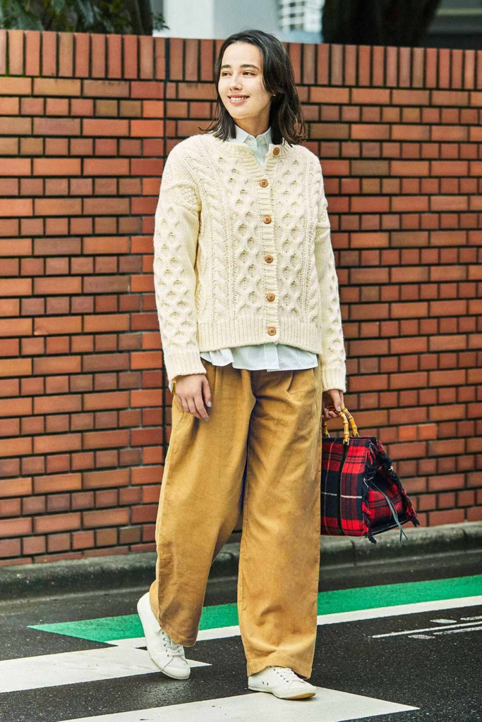 ざっくりとしたケーブル編みや木製ボタンがナチュラルな雰囲気を感じさせる、アイボリーのカーディガン。きちんと感のあるシャツをインして、品よく着こなします。ボトムスはコーデュロイ素材のワイドパンツでさらに季節感をプラス。すっきりした細身の白スニーカーで、清潔感たっぷりな足もとに仕上げます。