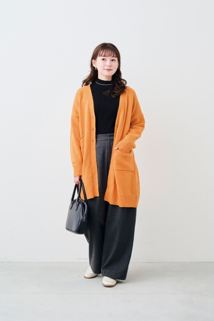鮮やかなオレンジ色のカーディガンは、ダークトーンになりがちな冬の着こなしを、一気に新鮮な印象へと導きます。おしりをすっぽり覆うロング丈なので、体型カバーができるうえにしっかり暖かさをキープできるのが嬉しいポイント。カーディガンが華やかなぶん、ニットやワイドパンツは定番色を選んで引き算すると品よくまとまります。