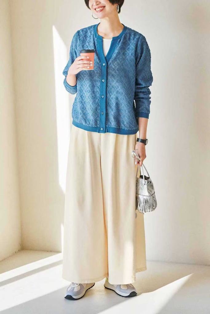 ぱっと目を惹くブルーのカーディガンは、透け感のあるジャカード素材で華やかさと主役級の存在感があります。シンプルな白のワイドパンツを合わせて、落ち着いた上品な着こなしに。足もとはボリュームのあるスニーカーではずしをきかせつつ、淡いグレーを選ぶことで清潔感をキープ。春にぴったりな、明るく好印象なパンツスタイルです。