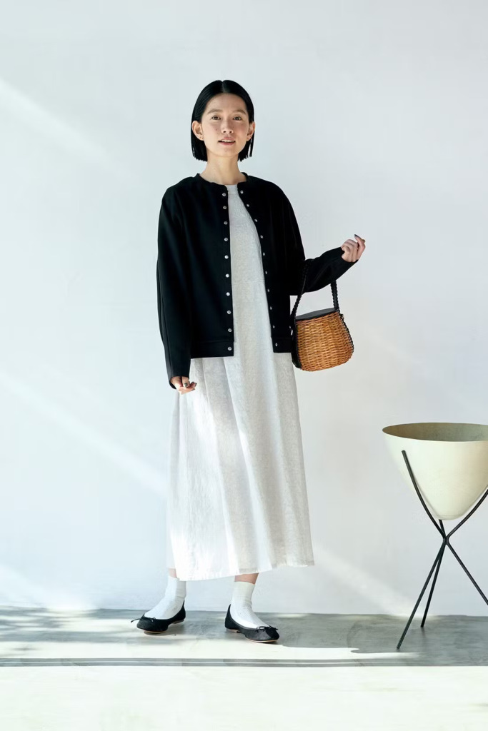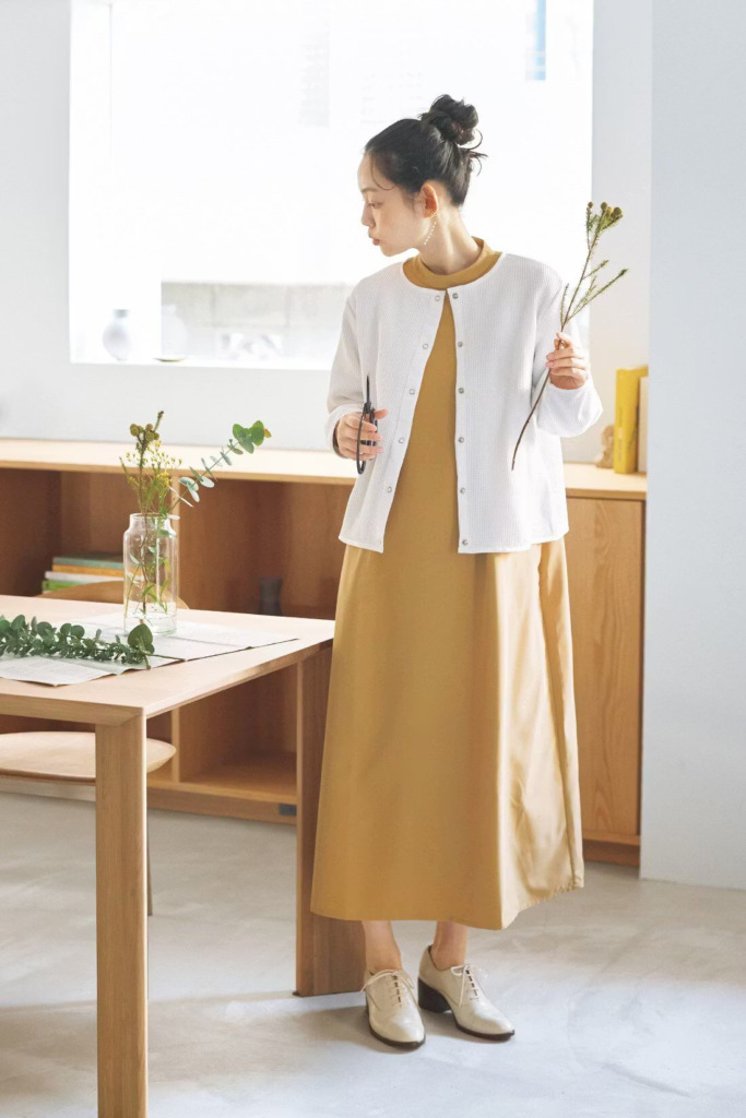 広がりすぎないAラインシルエットのワンピースに、白のカーディガンをさらりと羽織ったフェミニンな着こなし。カーディガンはカジュアルな表面感のかのこ素材で、肩の力の抜けたリラクシーな印象を与えます。上半身に白をもってくることで、顔まわりが明るく見える効果も。ヌーディーなシューズを合わせて、上品にまとめています。