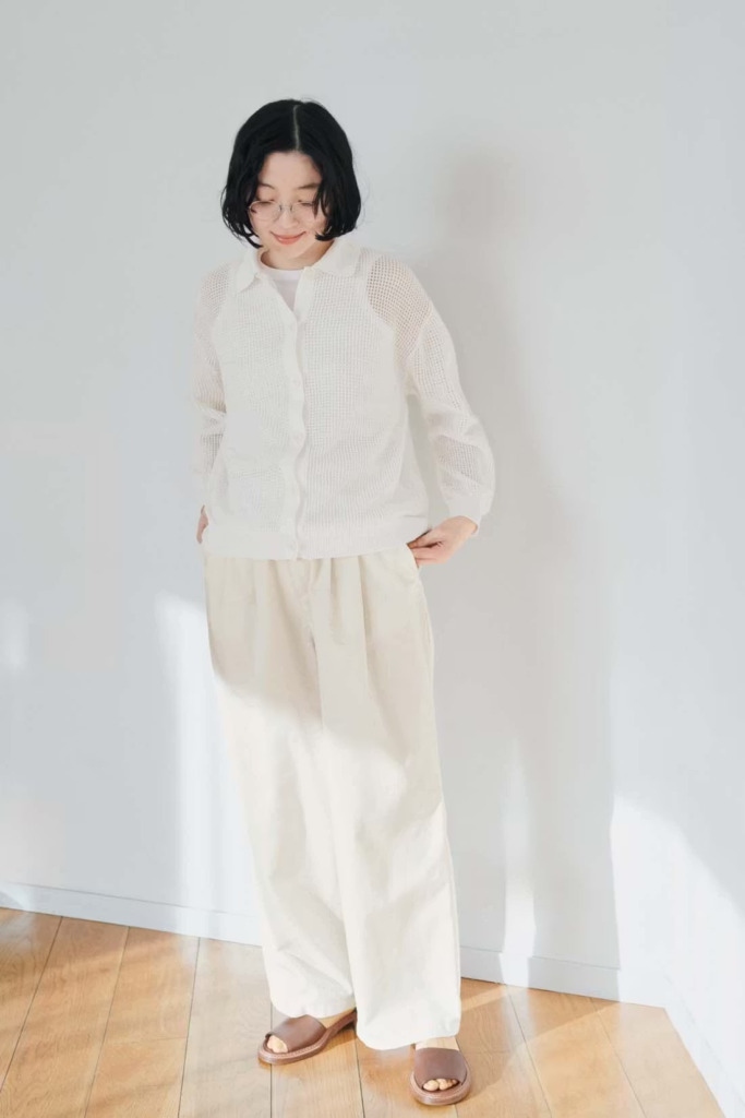 落ち着いた大人らしい着こなしがかなうワイドパンツも、カーディガンのこなれた上品な雰囲気と好相性。ショート丈からロング丈まで、合わせるカーディガンの丈を選ばないところも魅力です。白のワントーンでそろえれば、リラックス感のある着心地なのにきちんと見える洗練コーデに仕上がります。