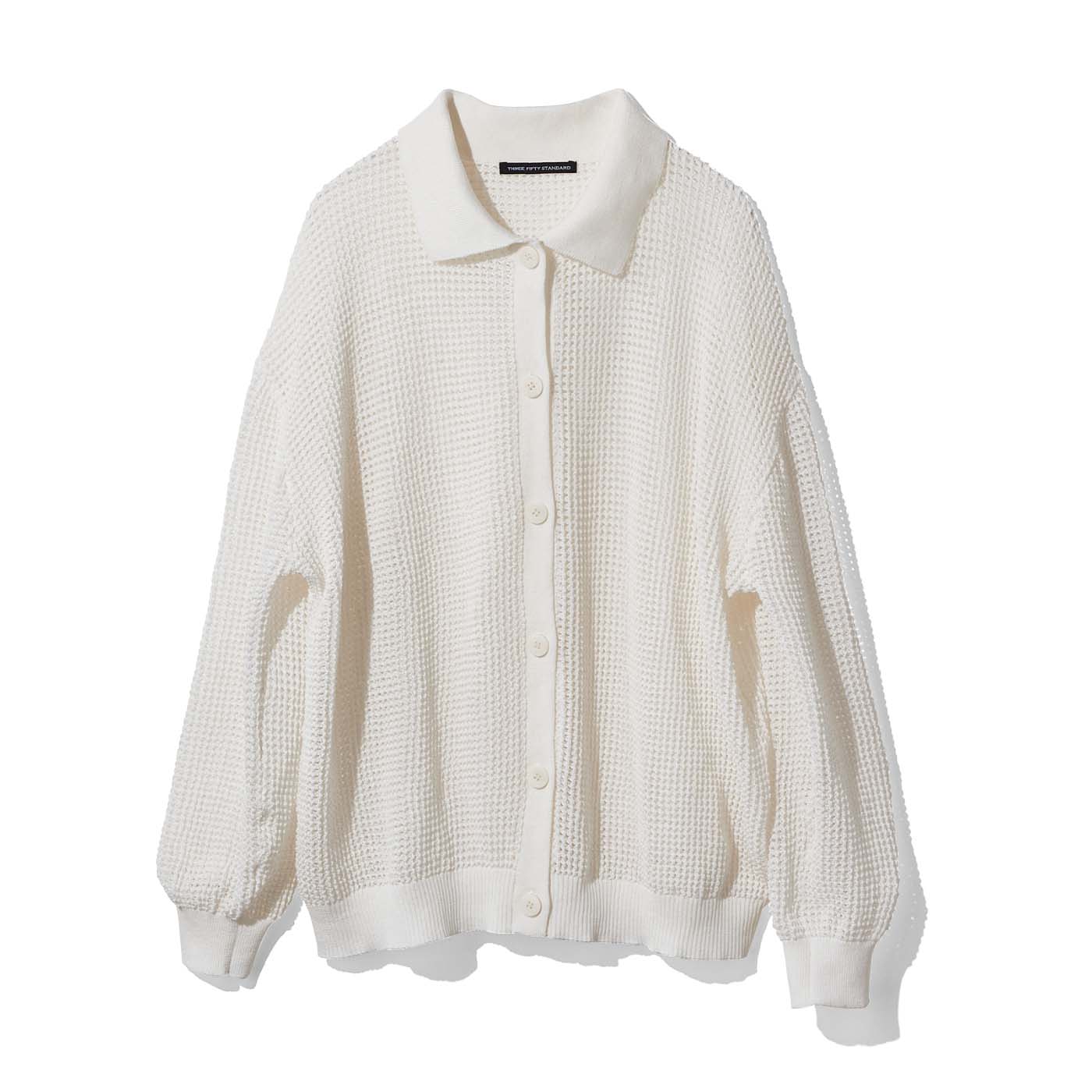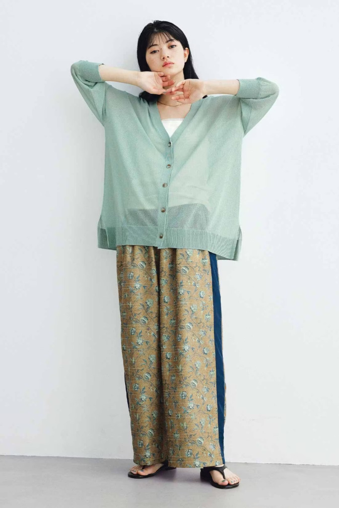 透け感のあるカーディガンは、オーバーサイズでも軽やかでこなれて見える優秀アイテム。レイヤードするインナー次第で、表情を変えられるのも魅力です。白インナーなら夏らしい軽快な雰囲気があり、上半身に抜け感を演出できます。総柄パンツを合わせれば、主張しすぎないのにしっかり着映えるスタイリングに着地。