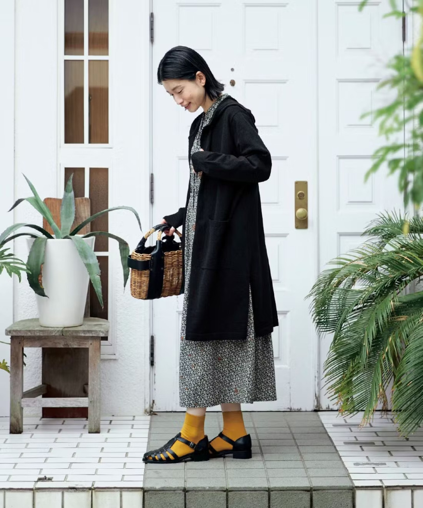 ワンピースとカーディガンは、いつの時代も愛される王道の組み合わせ。とくにフレアーシルエットのワンピースと腰丈の上品なカーディガンは、ガーリーな雰囲気で着られてフェミニン派の大人女性にぴったり。小物まで含めてベーシックカラーで統一すれば、甘すぎない落ち着きのあるスタイリングに着地します。