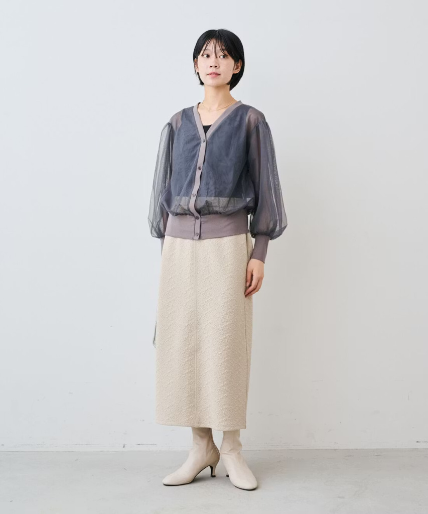 きれいめでフェミニンな印象を与えるタイトスカートは、上品なカーディガンとぜひ合わせたいアイテム。ショート丈のカーディガンとバランスが取りやすく、スタイルアップ効果も狙えます。華やかなチュール素材を取り入れたカーディガンなら、シンプルなワンツーコーデでもマンネリを感じさせず、今っぽい着こなしに。