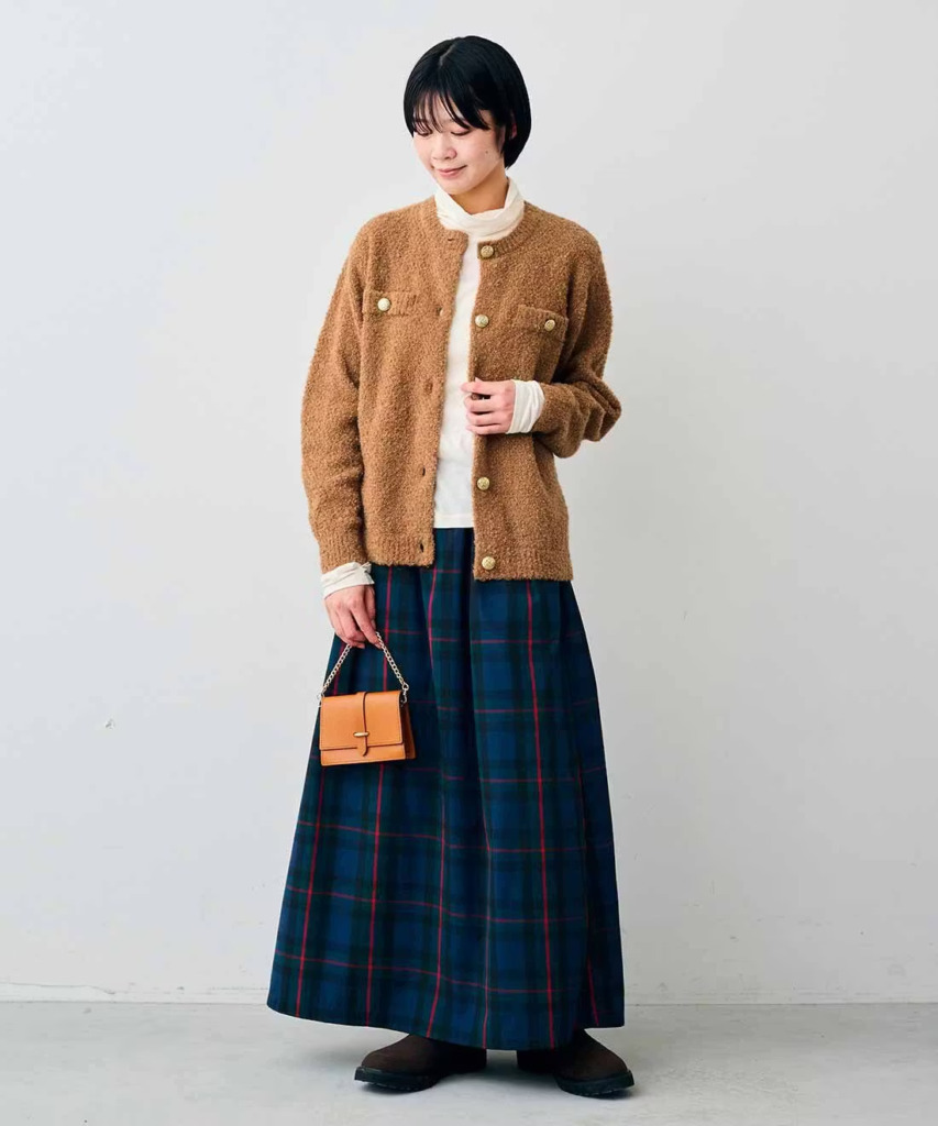 ふわふわとした質感とあたたかみのあるブラウンカラーのカーディガンは、大人女性らしい上品な華やかさが魅力。ジャケット風デザインなのできちんと感も与えられます。カラフルな色使いが目を惹くチェック柄スカートを合わせれば、レディーなムードの漂う秋コーデに。小ぶりで上品な小物を合わせて、全体のバランスを意識。