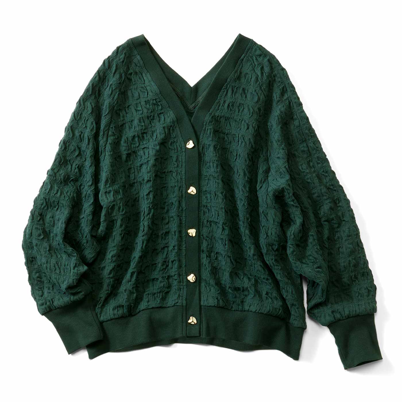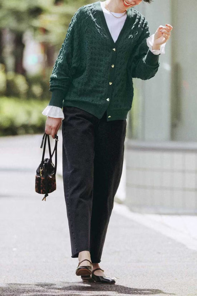 ぽこぽことした表面感が着映える、ダークグリーンのカーディガンが主役に。ゴールドのボタンが華やかなアクセントです。インナーは白のカットソーを選び、カーディガンのシックな色味を引き立てます。テーパードシルエットのブラックジーンズでリラックス感を添えたら、気負わないのにスタイリッシュな大人の休日コーデの完成。