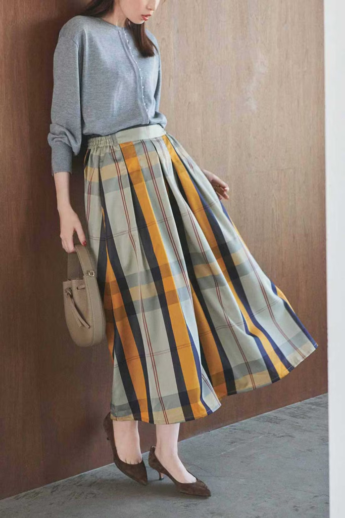 ドレスアップするほどではないけれど、普段よりおめかししたい日にぴったりな、パールモチーフが付いたカーディガン。前立てに連なるきらめきが、コーデをぐっと華やかな印象に導きます。大胆なチェック柄のフレアースカートでさらに特別感をアップ。レディーライクなパンプスとバッグを合わせて、エレガントに仕上げます。