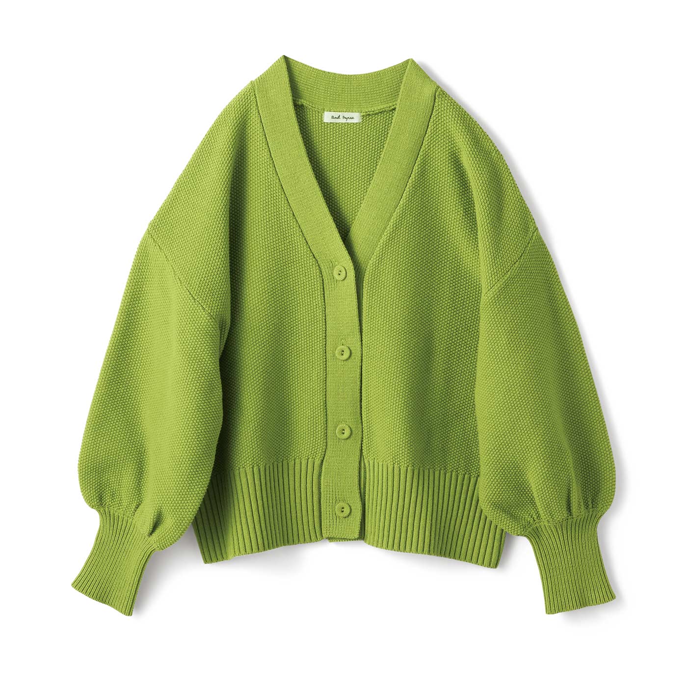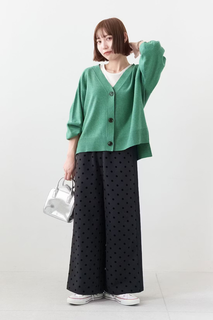 低身長さんは、重心を上げて見せることで好バランスな着こなしに。カーディガンはショート丈を選ぶとスタイルアップがかないます。鮮やかなグリーンや、大きめのボタンなど、ぱっと目を惹くディテールもポイント。ストレートなワイドパンツですっきりした印象をつくり、洗練された大人カジュアルな着こなしに仕上げます。