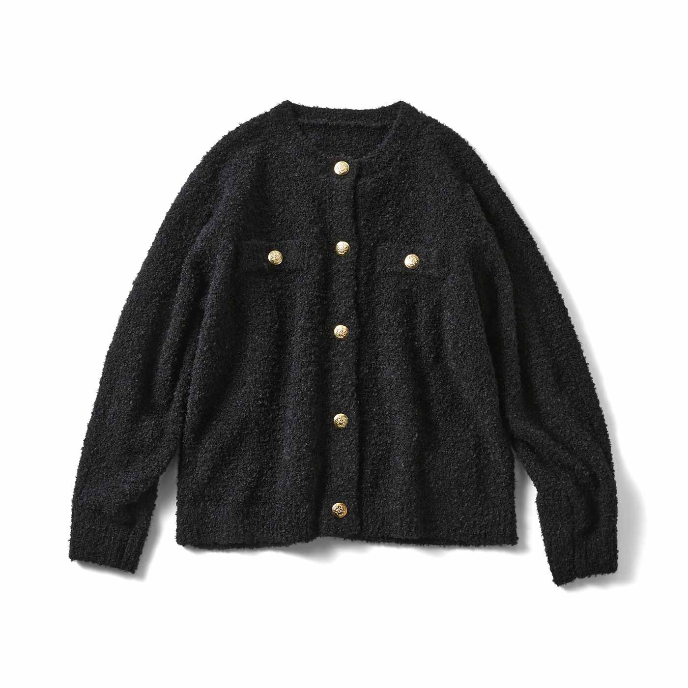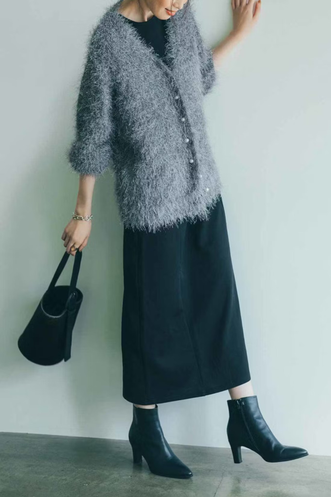毛足の長いフェザーヤーンニットのカーディガンは、腰にかかるやや長めの丈とゆったりサイズでリラックス感のあるシルエット。パール調のボタンが華やかなアクセントです。シンプルなタイトワンピースと合わせるだけで、上品でリュクスな着こなしに。かっちりした黒の小物で引き締めて、モード感たっぷりに仕上げます。