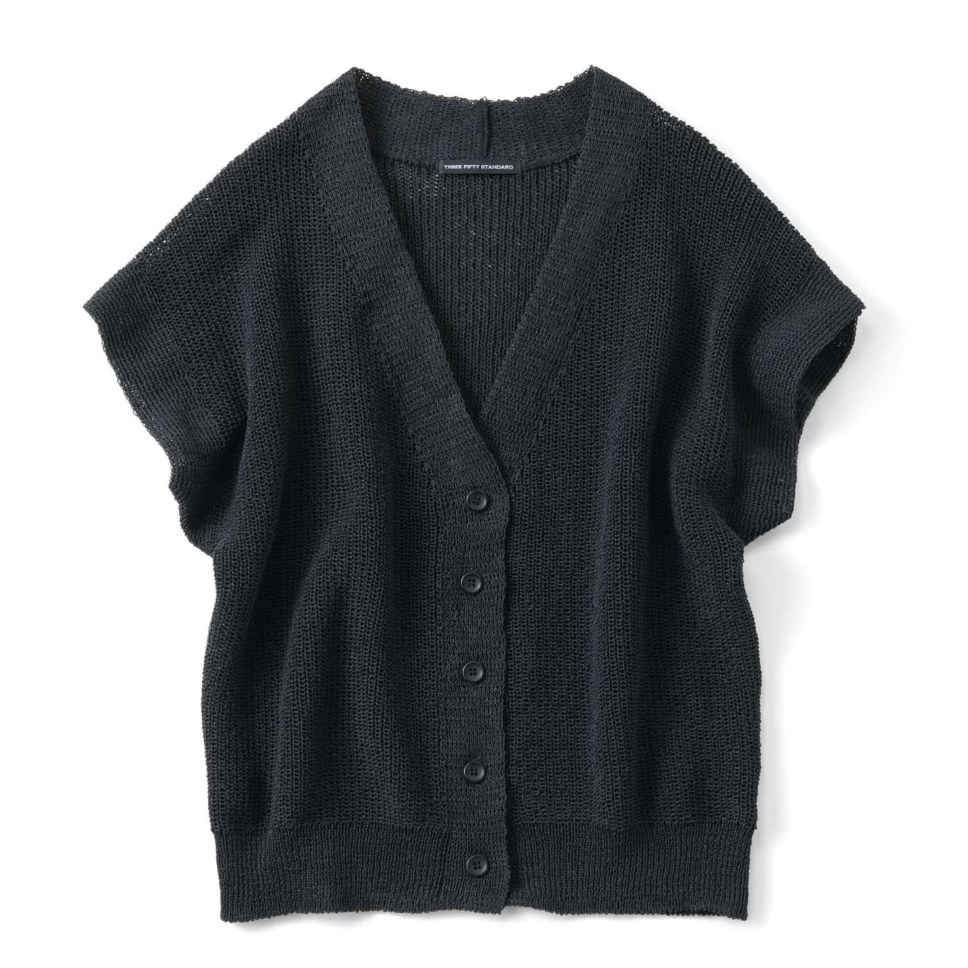 フレンチスリーブのベストタイプのカーディガンは、夏でも心地よく軽やかに着られるのが魅力。ざっくり開いたVネックが抜け感を演出し、さりげない小顔効果も期待できます。インナーをレイヤードして肌見せをおさえることが、大人らしい上品な着こなしのポイント。肌離れのいいゆったりしたワイドパンツは、暑い時期でも快適な着心地を叶えます。