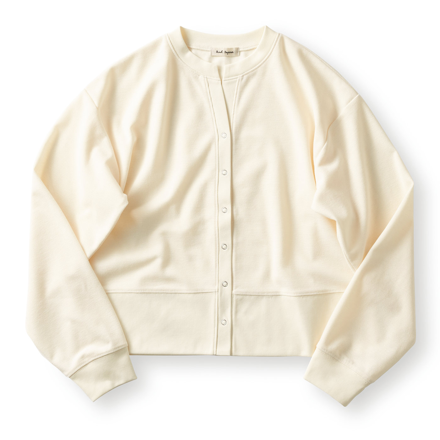 着心地のよさにもこだわりたい大人世代には、ベーシックで上質なカーディガンが欠かせません。肌ざわりのいいポンチ素材のカーディガンは、前立てに並んだスナップボタンが遊び心を感じさせるデザイン。長すぎず短すぎない絶妙な丈感で、どんなボトムスと合わせてもコーデを品よく格上げしてくれる一着です。