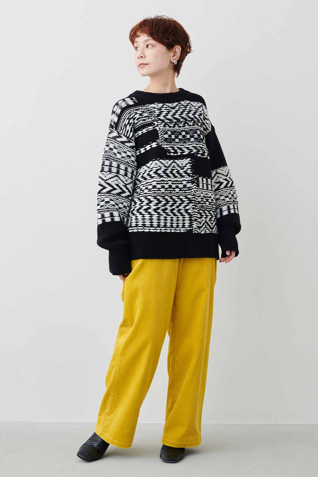 モノクロ総柄ニットはイエローのコーデュロイパンツで華やかに