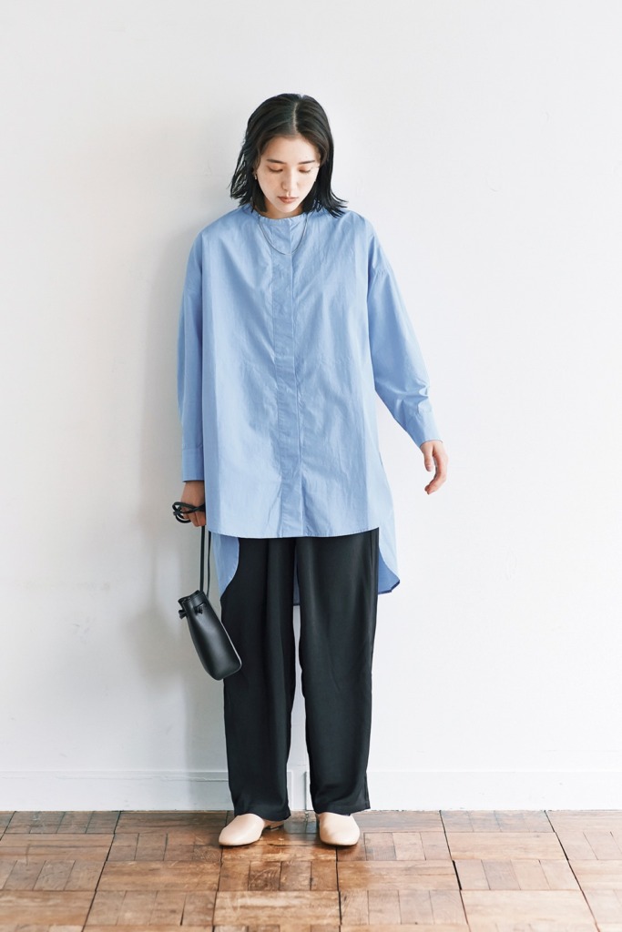 こちらはストレートシルエットのパンツを使ったコーディネート。足のラインをすっきりと見せてくれるパンツは、ぴったりしすぎない作りなので無理なく着こなしが楽しめます。