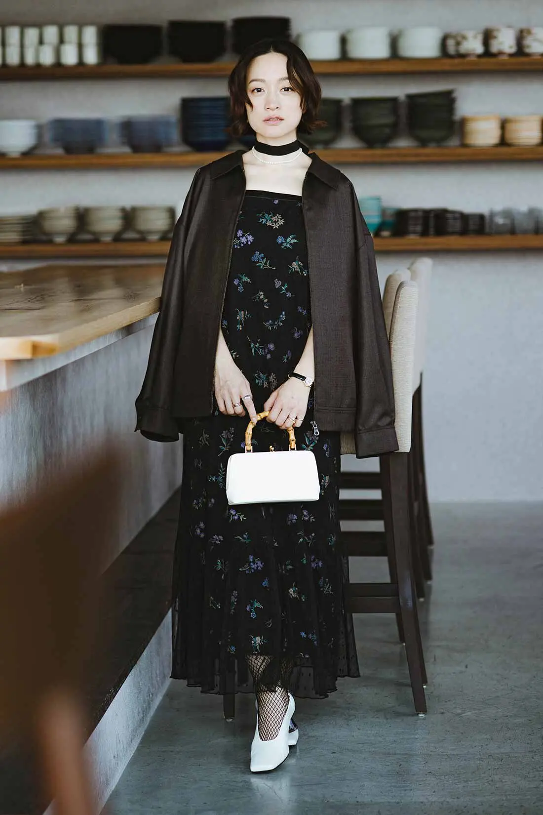 黒のシックさとペイズリー柄のカジュアルさをいいとこ取りしたシャツワンピは、旅に連れて行きたくなる1枚。落ち感のある生地とえり付きのスッキリとしたシルエットのおかげで、着心地もキレイ見えも両立。シンプルに1枚で着て、移動中はゆったりと過ごせます。外に出るときはコートやジャケットで重ね着を。