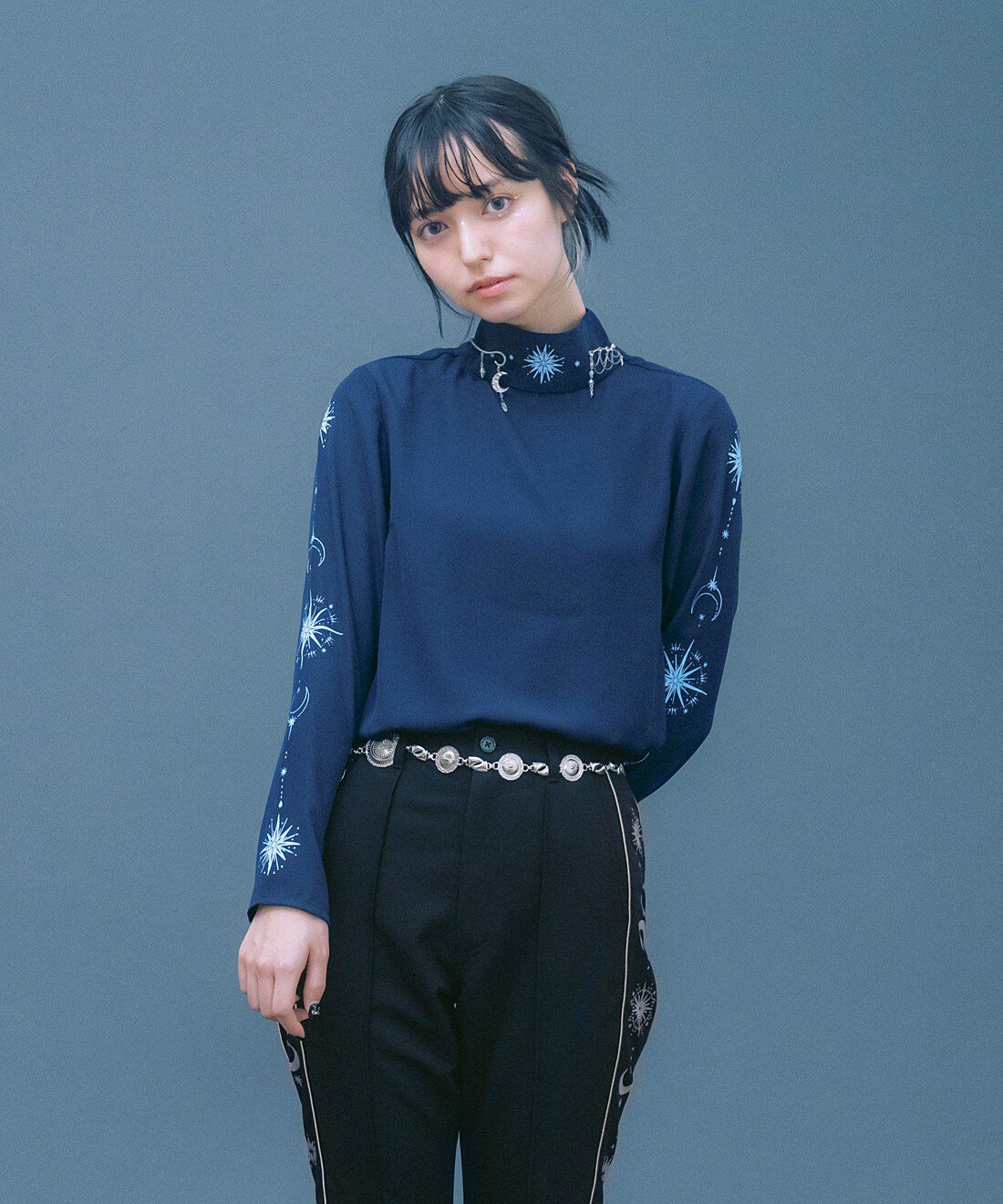 サイドのラインに沿って連なる月星のモチーフは、トップスの柄と連動した繊細なデザイン。そして、最大の魅力は計算し尽くされたシルエットにあります。