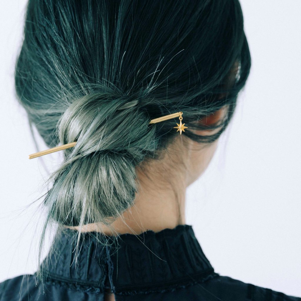 まとめ髪やハーフアップ、お団子など、ふだん使いのヘアアレンジにもひと挿しするだけで華やかな装いに。もちろん、特別な日のヘアアレンジの仕上げにも。まるで後ろ姿に星空をまとったかのよう。