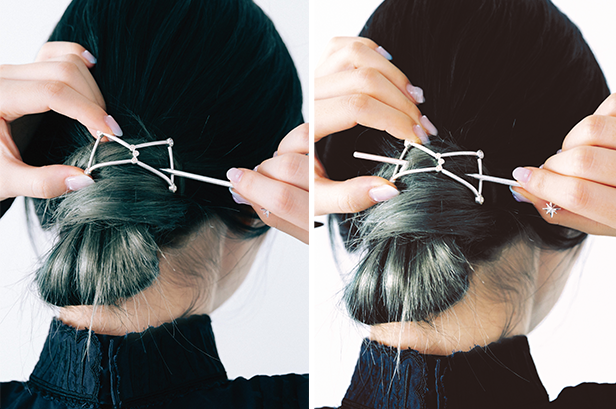 付けたいところで髪を結び、結び目の上に星座パーツを置きます。