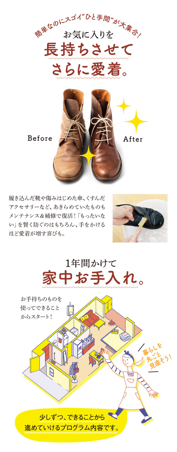 目標は「家のことを何でも自分でササっとできる人」! キッチン、水まわり、ファッション小物、雑貨など、日常に必要なあらゆるメンテナンス法を伝授します。アンケートをもとに、みんなが知りたいポイントと 、手軽に始められるひと手間お手入れにこだわりつつ、各分野のプロからのアドバイスもうれしい夢のレッスンで、「脱・使い捨て」&「長持ち」ライフに切り替えましょう! お手入れの工程はたっぷりの写真やイラストでていねいに解説し、専門家のアドバイスも充実。楽しい&わかりやすいテキストで、あなたのやる気を盛り上げます。
