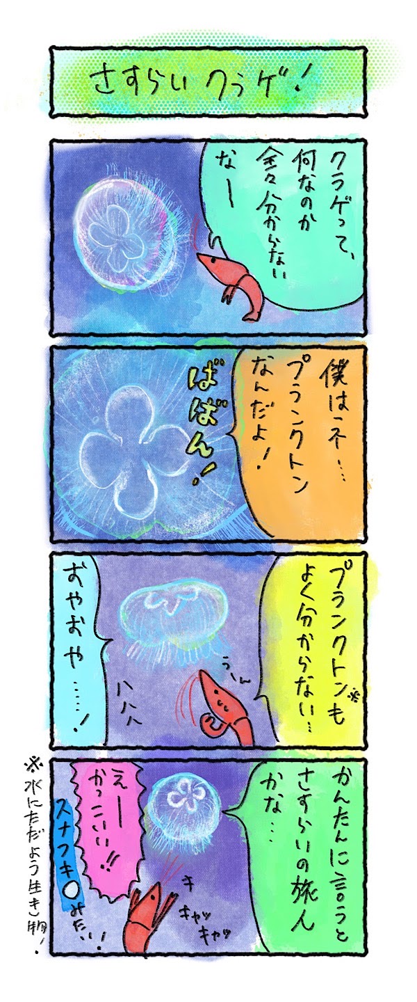 2020/11/25/Wed. さすらいクラゲ! みなさまこんにちは!海トーク122話、すしずの4コマ漫画です。今日の漫画の主役はクラゲ! 次回もおたのしみに~ 前の記事 バックナンバー 次の記事 かもめブログライターご紹介 すしず フリーダムクリエイター。エビの絵をたくさん描いたりグッズなど色々作ってます。デザインフェスタなどイベントでも活動中。エビちゃんLINEスタンプ好評発売中!動くのもあるよ。 WEBSHOP【ダークサイドプエーン】や、 ヴィレッジヴァンガードルミネエスト新宿店、スピンズ池袋店でエビちゃんグッズ販売中! Tweet コメントを残す コメントをキャンセルペンネーム ※ ペンネームを保存する。 コメント ※ email confirm* post date*