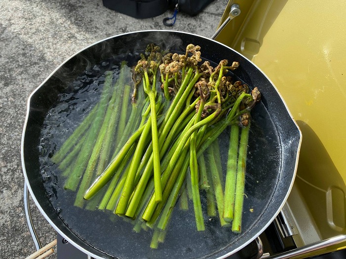 ダイビングを終えて、夕方はゆんたく。誰もいない港に行って、長野から圭ちゃんが持ってきてくれたワラビをシンプルに頂く。