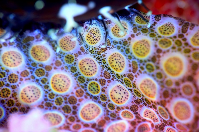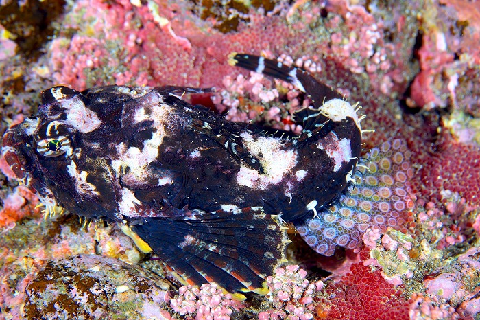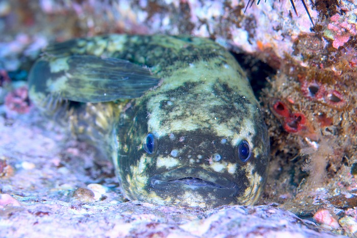 水中では驚きの出会いも。これは北の海だけにいるオニカジカというお魚なんですが、右のとこにすごいドットのデザインがあるでしょ?これは腹鰭で、この雄は、この腹鰭をメスに見せて、求愛してるんです ……。