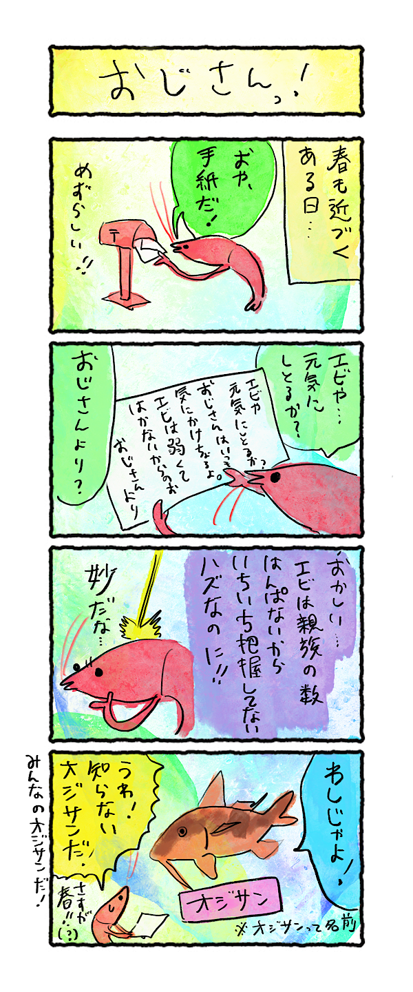 2022/03/03/Thu. おじさんっ! みなさまこんにちは!海トーク186話、すしずの4コマ漫画です。 今回は、エビちゃんの「おじさん」!?が登場~ 次回もお楽しみに~。 前の記事 バックナンバー 次の記事 かもめブログライターご紹介 すしず フリーダムクリエイター。エビの絵をたくさん描いたりグッズなど色々作ってます。デザインフェスタなどイベントでも活動中。エビちゃんLINEスタンプ好評発売中!動くのもあるよ。 WEBSHOP【ダークサイドプエーン】や、 ヴィレッジヴァンガードルミネエスト新宿店、スピンズ池袋店でエビちゃんグッズ販売中! Tweet コメントを残す コメントをキャンセルペンネーム ※ ペンネームを保存する。 コメント ※ email confirm* post date*