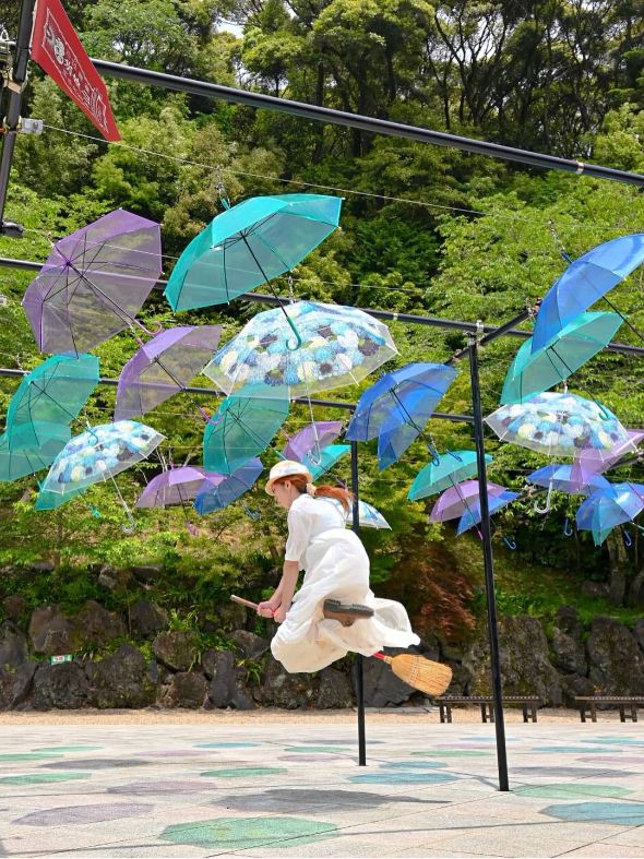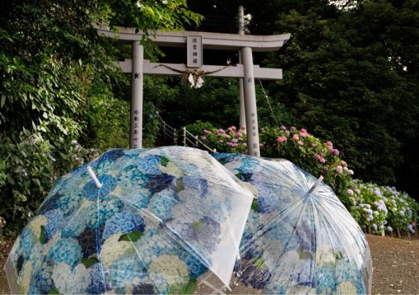 手前の紫陽花傘が、背景で咲き誇る本物の紫陽花と見事な共演ですね。鳥居のある神社の風景と合わさることで、雨の季節ならではの情緒と世界観が生まれており、その発想力に感銘を受けました。