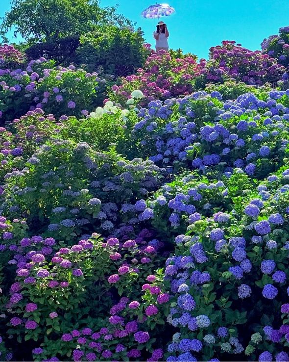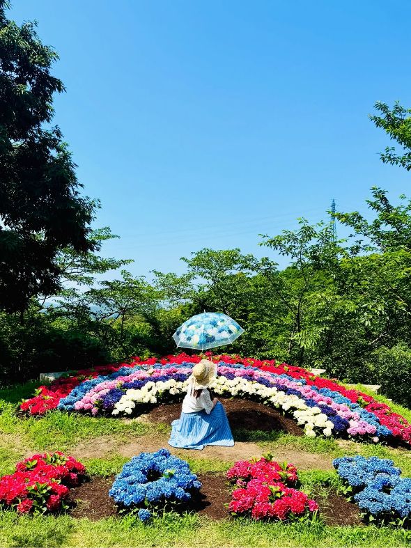 いろとりどりの紫陽花で作られた虹と手前の紫陽花が、女性をやさしく包み込むうつしい構図ですね。あざやかな花々と、突き抜けるような青空のコントラストが見事な世界観です。