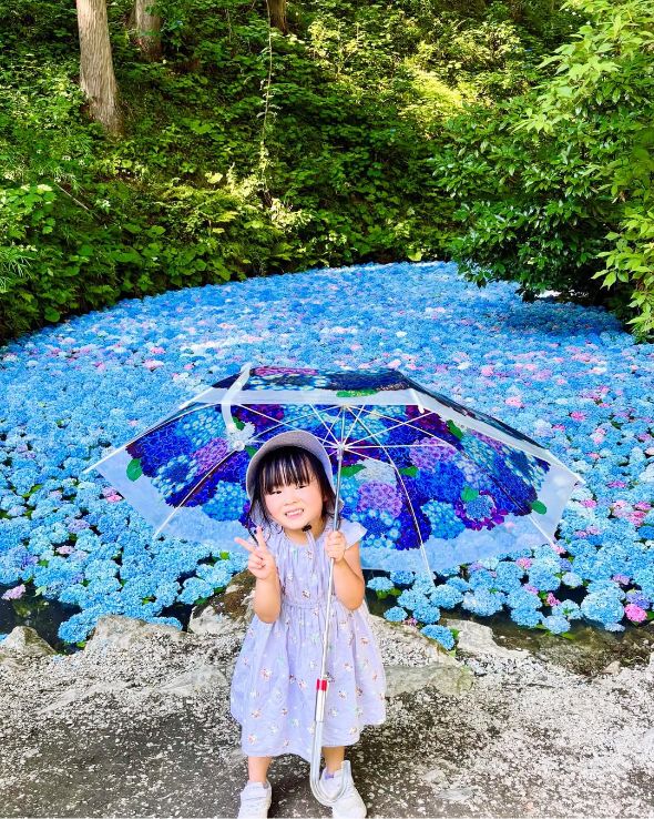 うしろの紫陽花と傘が一体化して、まるで特大の紫陽花傘をさしているみたいに見えました!ワンピースの色も紫陽花にピッタリですね。