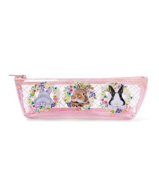 お花のリースからうさぎたちがひょっこり顔を出すデザインの歯ブラシポーチ。